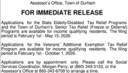 Applications are now being taken for the State Elderly/Disabled Tax Relief Programs, the Town of Durham Senior Tax Relief Programs (Freeze or Deferral), and the Additional Veterans’ Exemption Program.