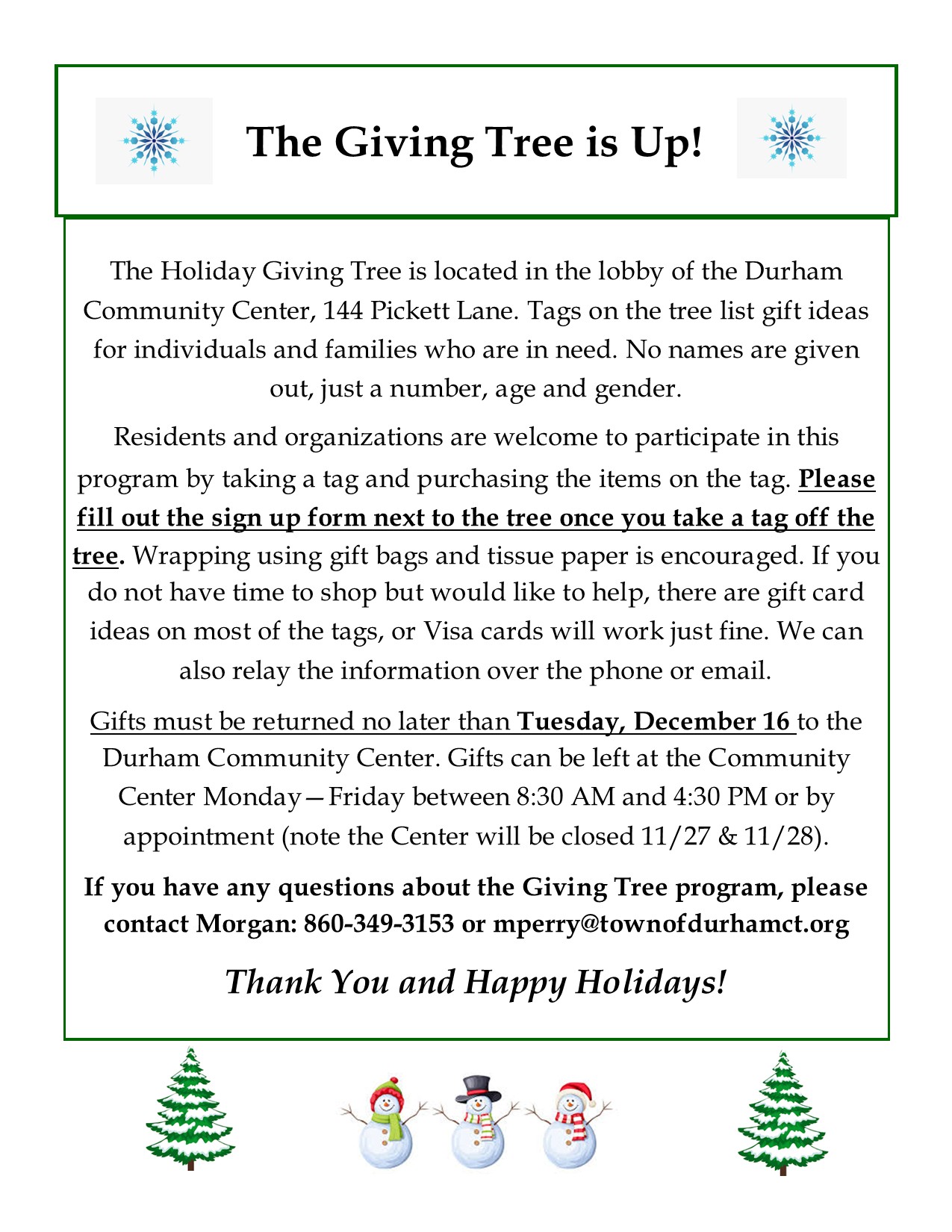 If you have any questions about the Giving Tree program, please contact Morgan: 860-349-3153 or mperry@townofdurhamct.org