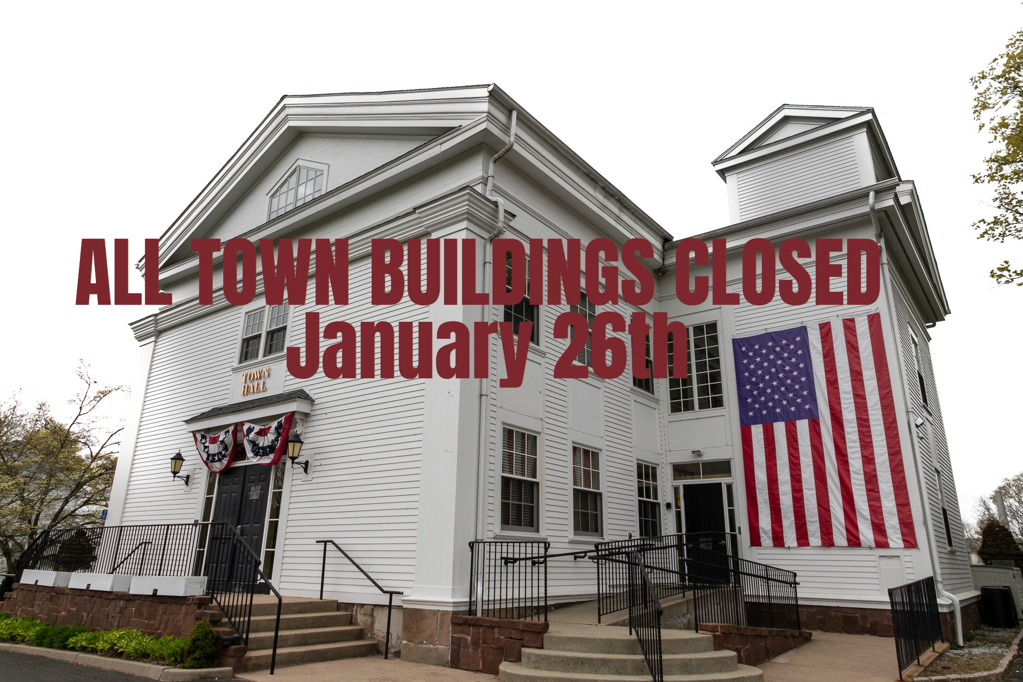 Town buildings, including Town Hall, Community Center, Library and Transfer Station, will be CLOSED on Monday, January 26th due to the winter storm. Normal hours will resume Tuesday, unless otherwise notified.