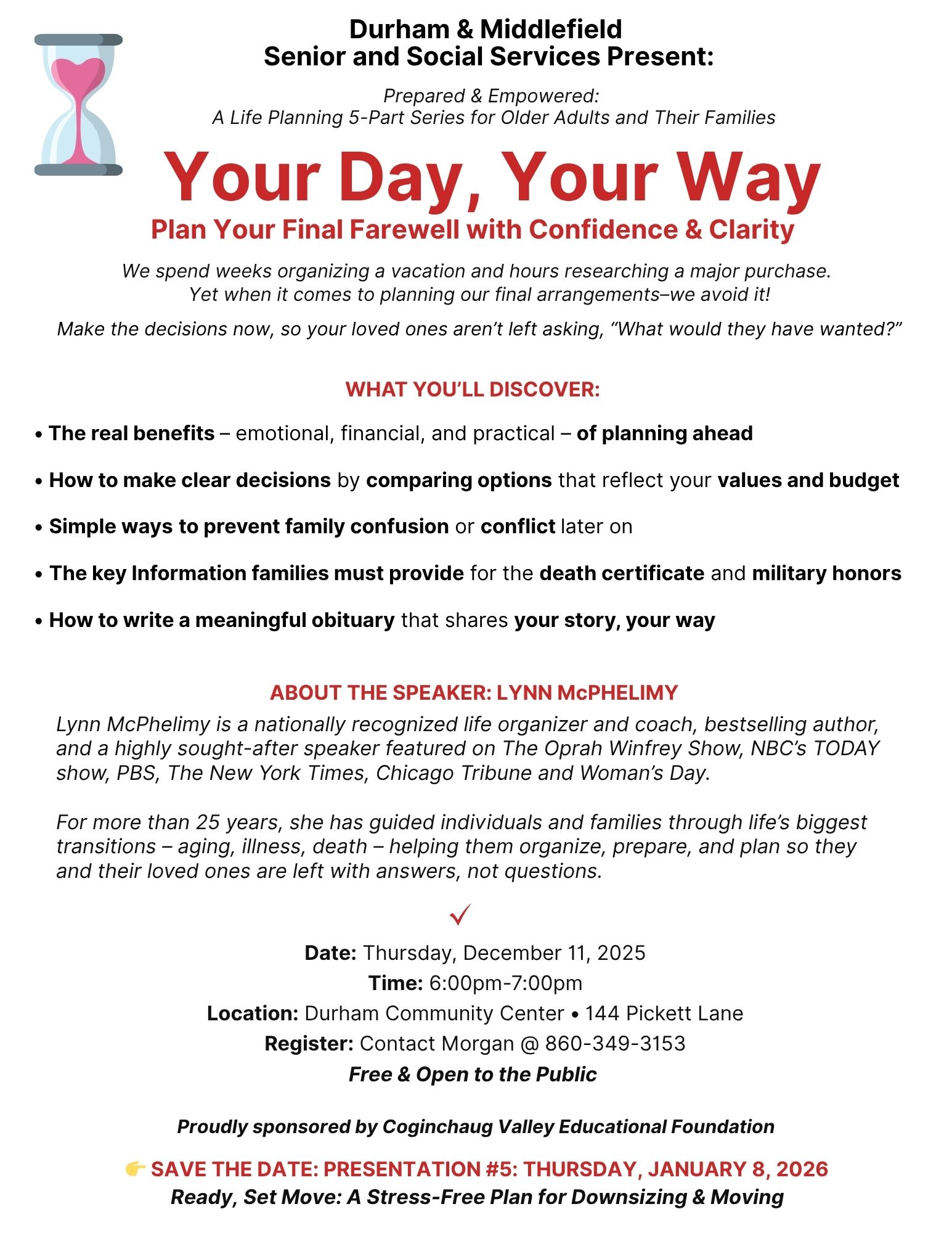 Lunches for folks aged 60 or older are held at the Durham Community Center, 144 Pickett Lane, Mondays and Wednesdays from 11AM – 1PM with lunch served at noon. Please sign up by Wednesday each week for the following week by calling, emailing, or using the sign-up sheets available during lunch.